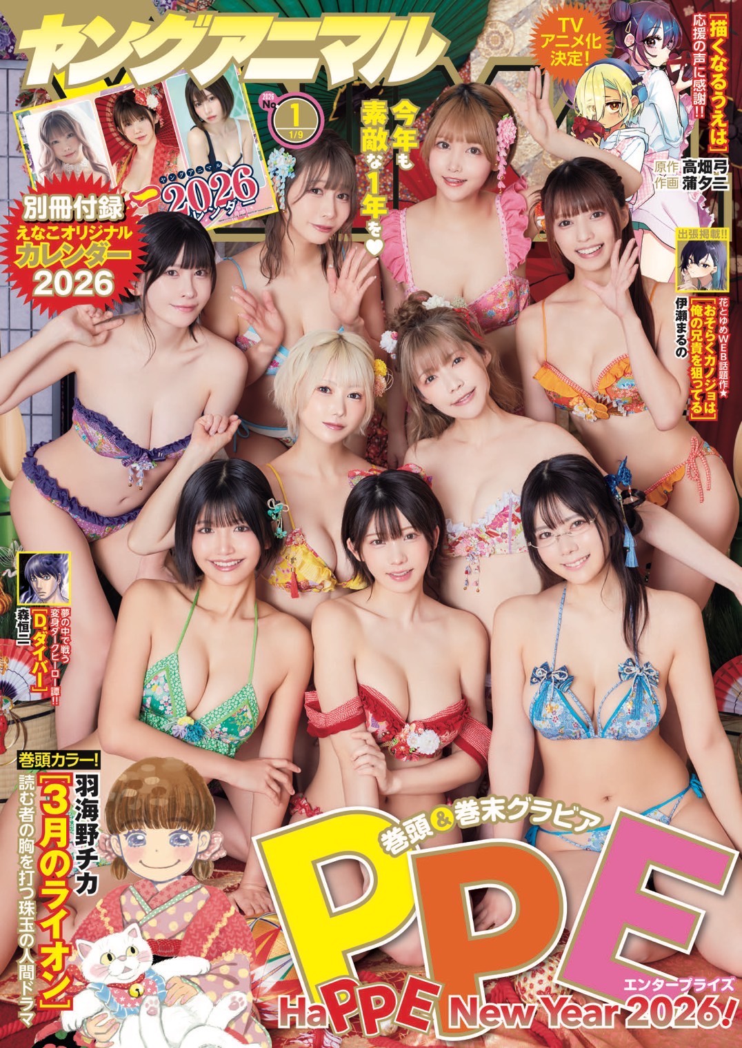 〇表紙・巻頭グラビア「PPエンタープライズ」えなこ・東雲うみ・篠崎こころ・南あみ・高見奈央・えい梨・みゃこ・篠原みなみ・よきゅーん 新しい年の幕開けを、彼女たちのまぶしい晴れ姿とともに!和の気品に、ふっとこぼれる笑顔。PPエンタープライズの“年初めグラビア”、開運気分でご覧あれ♪